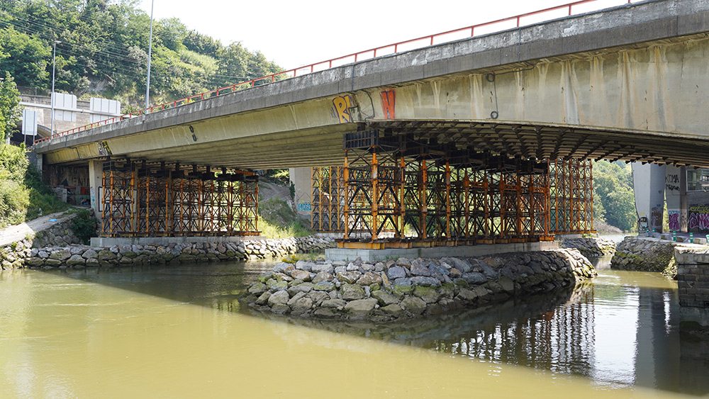 Dadas las dimensiones del viaducto, el refuerzo requería sostener cargas de gran magnitud a lo largo de 111 m de longitud, combinando distintas estructuras metálicas para soportar las dos calzadas. En total, se instalaron seis puntos de apoyo adicionales: cuatro sobre el cauce del río Urumea y dos en tierra firme. Para ello se recurrió a un sistema de cimbras T-500 de gran capacidad, configuradas en módulos de 2x2 y con alturas de hasta 15 m, que en algunos puntos se complementaron con torres más ligeras, cimbras T-125.