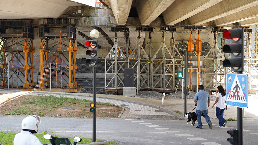 - Fase 1 (ya ejecutada): Intervención de emergencia mediante el apeo de los vanos más afectados, reforzando las zonas críticas sin interrumpir la circulación. Todos los trabajos se realizaron por debajo del tablero.