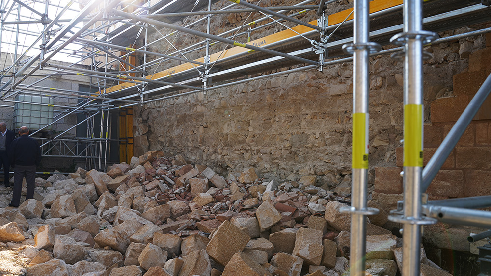 El colapso afectó a una sección del muro norte, formado por dos hojas exteriores de sillería y un núcleo interno de calicanto de menor calidad. La pérdida de forma y el desplazamiento de varios sillares provocaron una excentricidad progresiva que acabó comprometiendo la estabilidad de la cornisa y parte de la cubierta. El objetivo principal de la intervención ha sido evitar un desprendimiento total del muro afectado y garantizar la seguridad del personal durante los trabajos de consolidación.