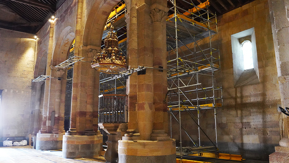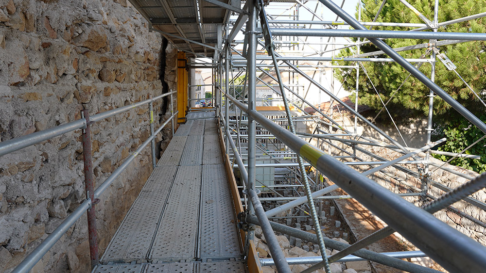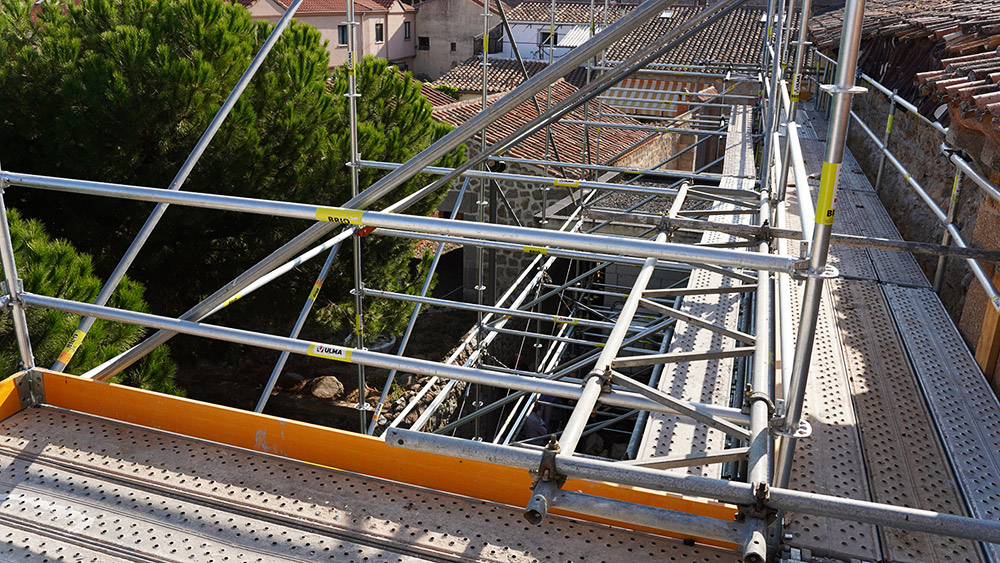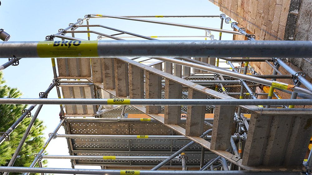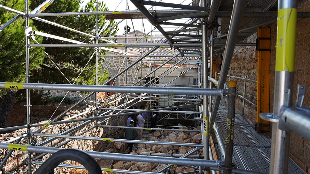 Los trabajos se desarrollaron en dos frentes. En el exterior, se instaló una estructura exterior exenta de 16 m de longitud y 8 de altura sin amarres a los muros de la iglesia formada por un estabilizador andamio multidireccional BRIO y su nuevo sistema de cercha SCB, permitiendo crear un vano libre en la zona derrumbada de 12 metros de luz, y contrapesos de entre 8 y 10 kN, diseñada para absorber las cargas laterales y mantener la verticalidad del muro. La conexión con el muro se resolvió con el sistema ENKOFORM, formado por cabezales y vigas VM, proporcionó una unión firme y adaptable a las irregularidades del paramento. Cada 2 m se dispusieron plataformas de trabajo con barandillas y accesos laterales, que permitirá avanzar con seguridad en la reconstrucción del muro.