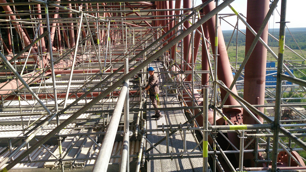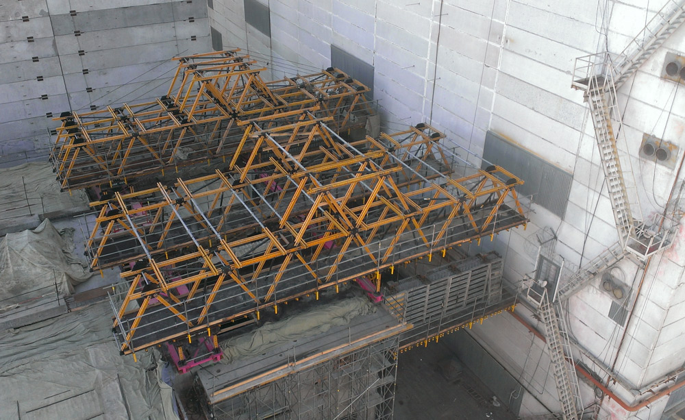 Durante el proceso de izado de la estructura principal del arco, se han instalado andamios BRIO en forma de plataformas de trabajo y sistemas de acceso para el montaje de instalaciones y revestimiento del sarcófago.