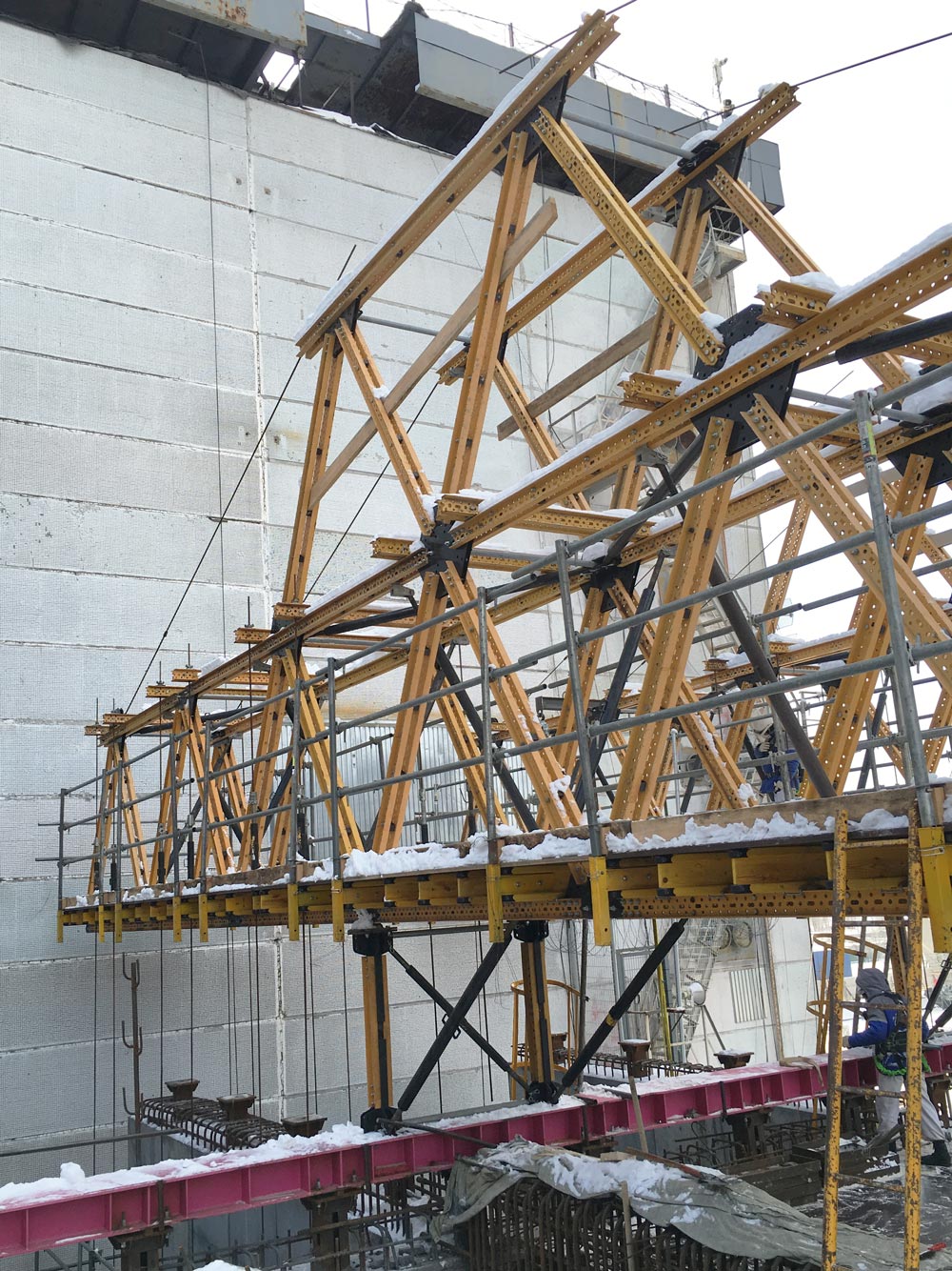 También se ha utilizado el sistema MK en los voladizos de 8 m, mediante estructuras de 2,5 m de altura, lo que ha permitido la preparación del techo sin accesos desde el suelo.