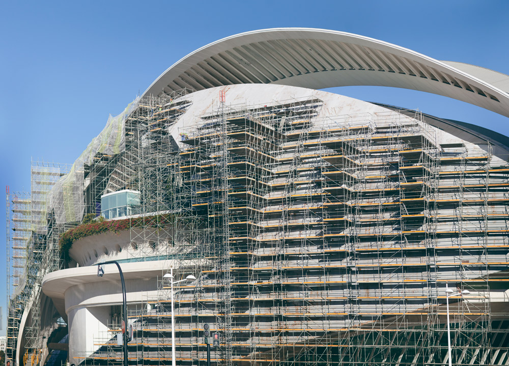 Para abarcar la forma curva del edificio del Palacio de las Artes, se han empleado 48.000 m³ de volumen de andamio y 12.000 m² de andamio de fachada mediante vuelos consecutivos.