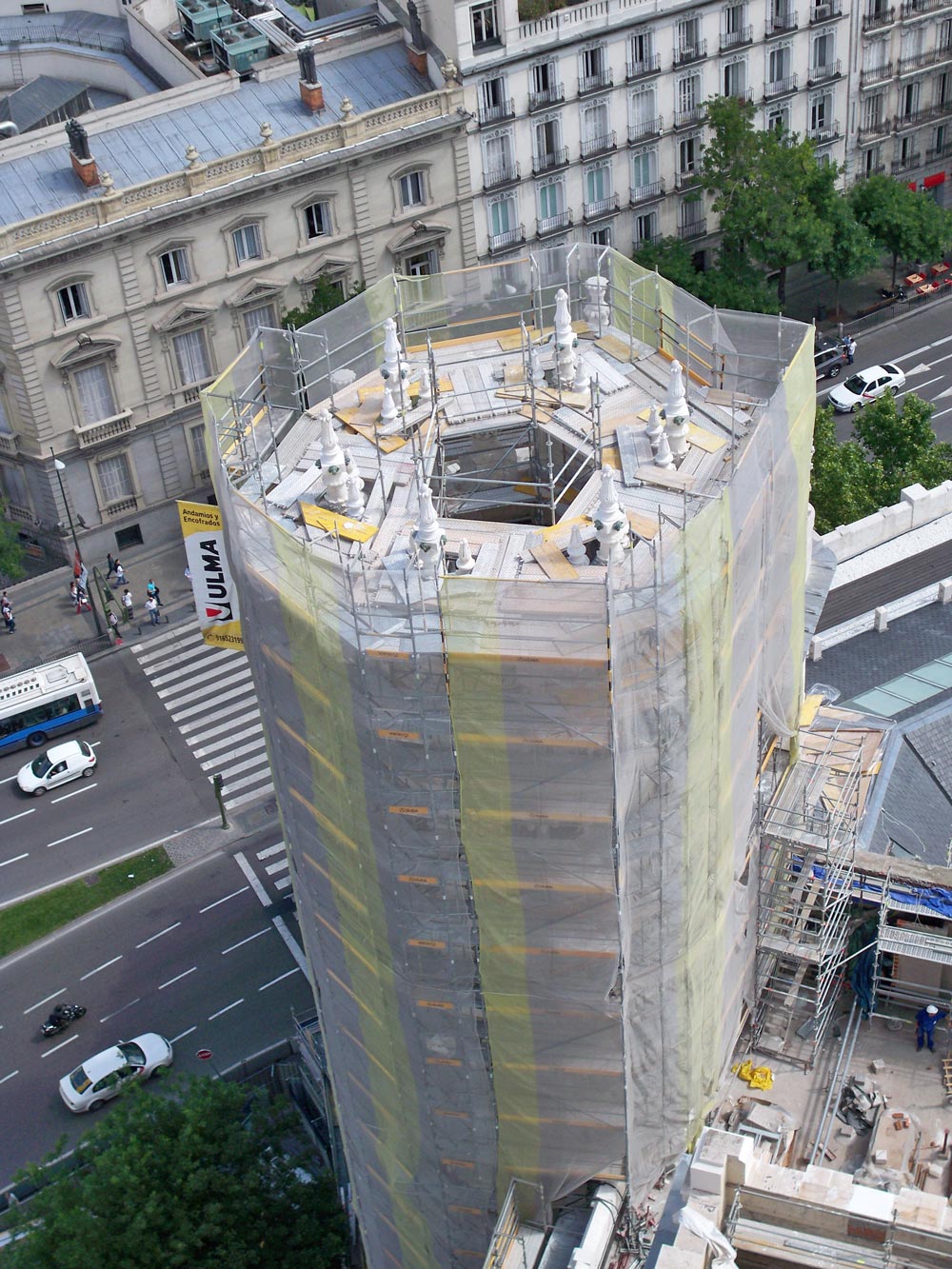 Acceder a las caras laterales de los torreones y evitar el montaje desde el suelo, requería de un andamio con vuelos. El Andamio Multidireccional BRIO lo permitió. En las caras cuyo montaje se realizaba desde el suelo, se empleó el andamio DORPA, idóneo en trabajos de fachada. Para minimizar el impacto en la vía pública se instaló el andamio BRIO, que permitió habilitar pasos peatonales.