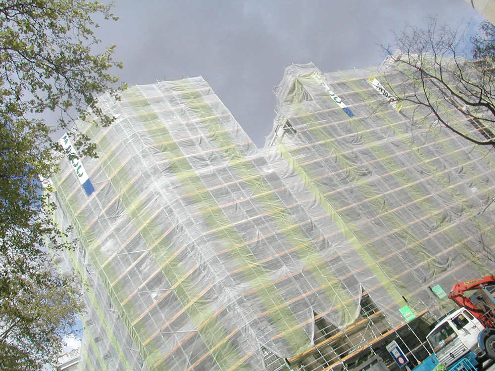 Ante las características de la obra, se realizaron cálculos de estabilidad en cada fase de montaje, así como un riguroso seguimiento del amarraje del andamio a la fachada.
