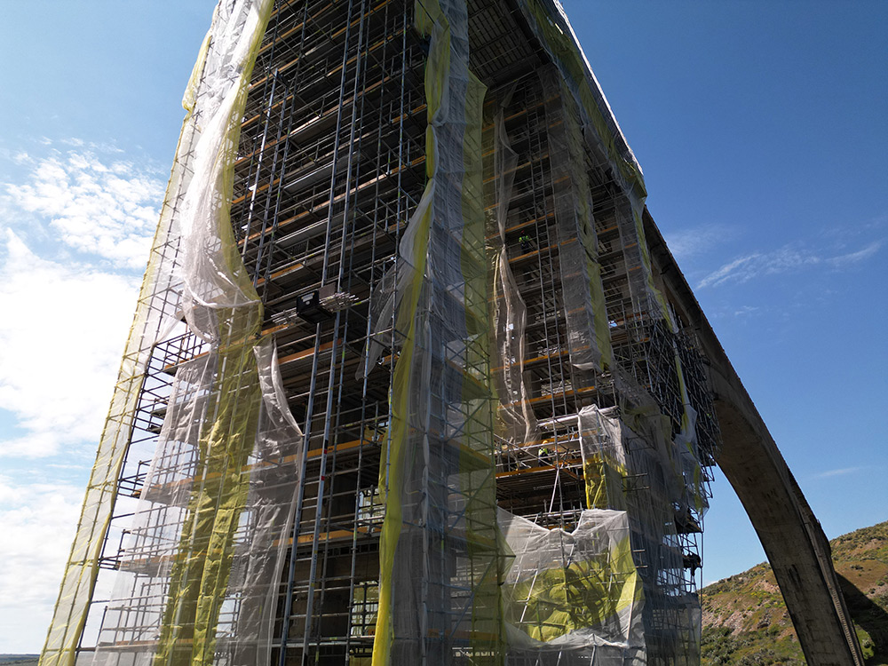 La solución técnica clave de esta intervención es el uso del andamio multidireccional BRIO, que se ha adaptado a la compleja geometría del puente para facilitar el acceso a todas las zonas de trabajo, tanto en la parte superior como inferior del arco, pilares, tablero y laterales del viaducto, realizando el montaje del replanteo mediante vuelos sucesivos.