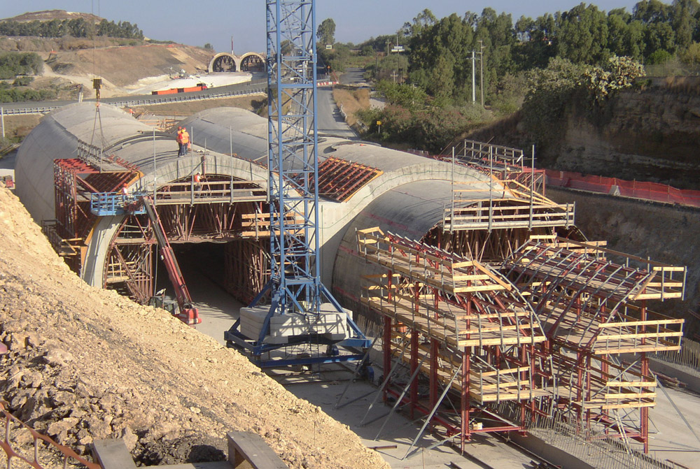 El falso túnel de doble vía forma parte de las obras de la autopista que circula entre Catania y Siracusa. Con una longitud aproximada de 800 m, ambos túneles disponen de 30,5 m de ancho, con una altura máxima, desde la fundación hasta la clave, de 9,5 m y un diámetro interno de 13,5 m. La ejecución de las dos galerías se realizó de forma simultánea, a cielo abierto y con elementos estándares de Estructuras MK.
