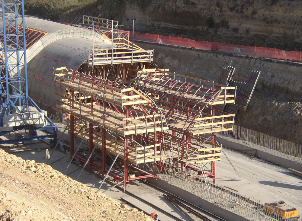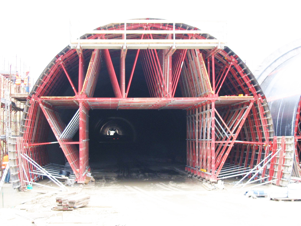 El sistema MK, empleado en este proyecto, consistió en un carro porta encofrado para el interior del túnel, así partiendo de los arranques fue posible realizar la sección completa. El carro se desplazaba sobre una viga de carril, donde avanzaba el sistema de rodadura, por lo que la ejecución del túnel, en su longitud, se realizó en tramos de 12,5 m. Los ritmos de trabajo se incrementaron ya que los paneles empleados para efectuar la bóveda se suministraron premontados.