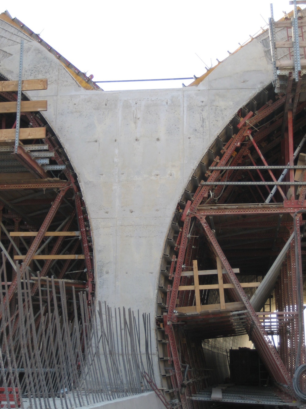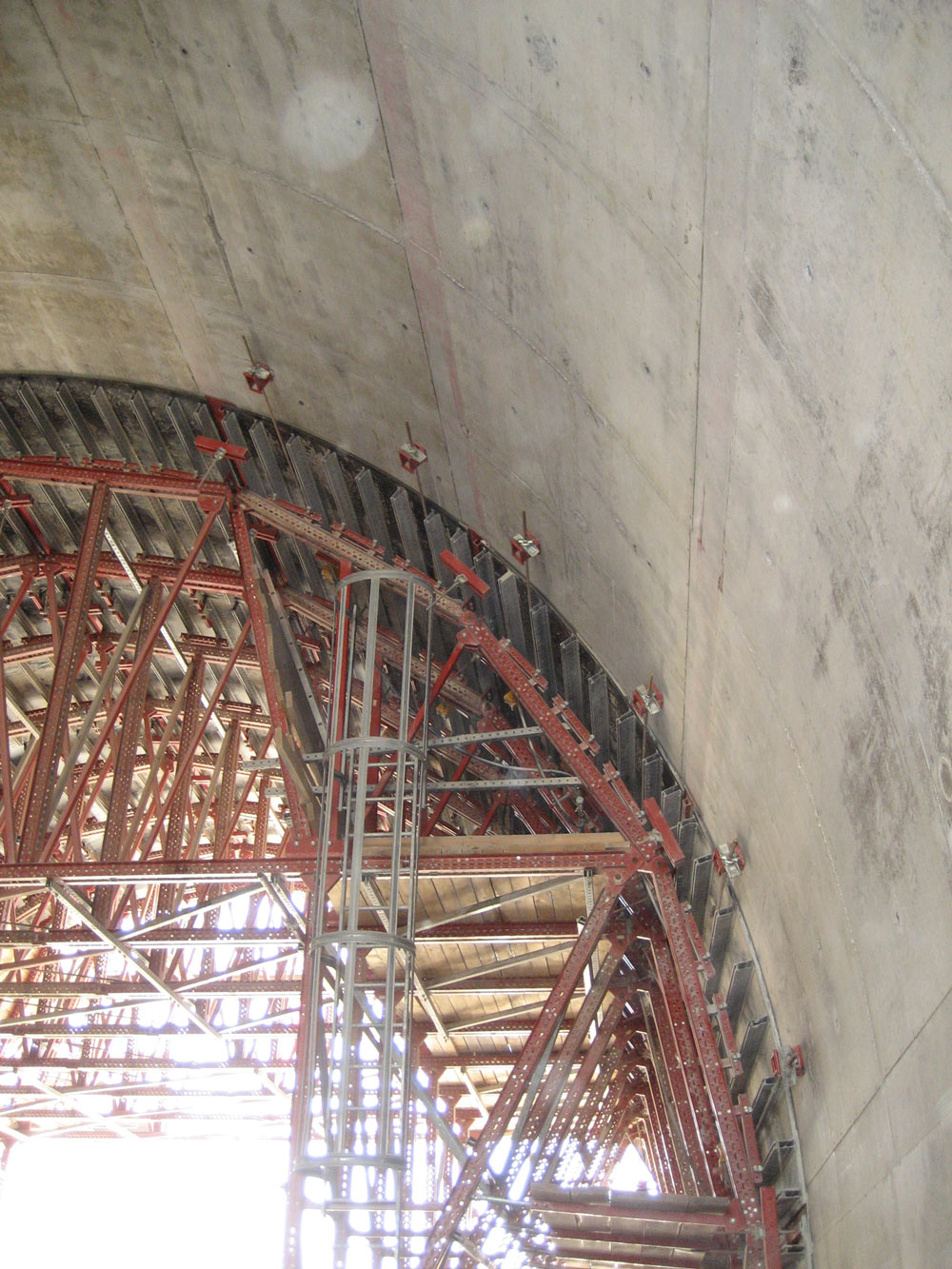 El encofrado interior estaba equipado de un sistema hidráulico que permitió su desplazamiento tanto en sentido vertical como horizontal, consiguiendo así un mayor rendimiento y bajos costes de ejecución. Además, los encofrados dispusieron de un sistema neumático de vibración exterior que proporcionó al hormigón un acabado de alta calidad y redujo los tiempos de ejecución.