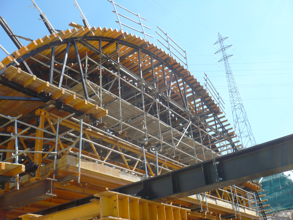Los trabajos se realizaron a 17 metros de altura, ya que en el piso inferior circula el metro y las losas intermedias tienen un espesor reducido. Al no poder emplear el sistema de cimbra cuajada, se planteó una compleja solución técnica: a partir de un carro porta-encofrado en altura, y apoyado en Cimbra T-500, Estructuras H-33, BRIO y riostras curvas, se salvaron refuerzos transversales de hormigón cada 5,2 m.