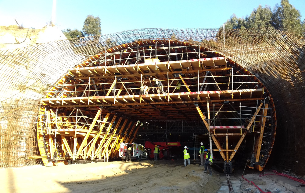 Y por último un sistema de carro de encofrado MK para permitir el hormigonado del túnel. Con un mismo carro es posible realizar distintas geometrías en un mismo túnel; de ahí que se haya empleado en este caso ya que consta de cuatro secciones tipo en las que varía el fondo de la sección. Además, está solución ha contemplado el paso de vehículos, necesario en este tipo de proyectos.