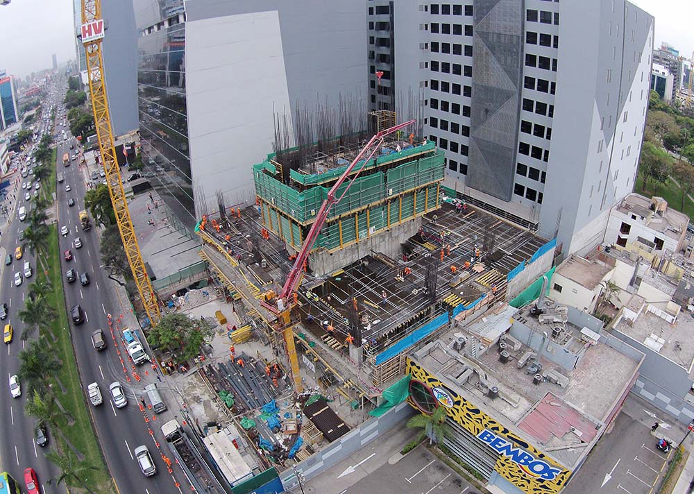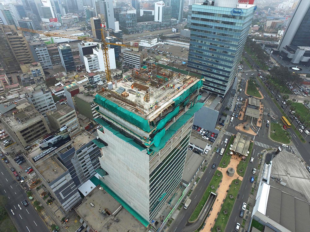 Ubicada en el centro financiero de Perú, la torre comercial de más de 90 m de altura será uno de los edificios más altos de Lima. Cuenta con 27 pisos de diseño vanguardista y 9 sótanos construidos en un área de 82 401.32 m².