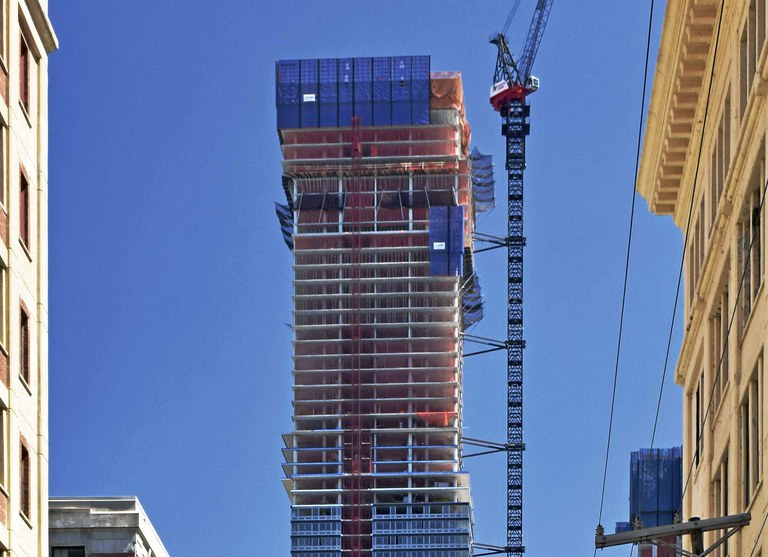 El perímetro de la torre se ha protegido con las pantallas HWS, un sistema de seguridad compuesto por paneles ligeros de sección recta y sin plataformas de trabajo. Así, se han agilizado los movimientos en obra y se han protegido a las personas y al equipo de caídas.