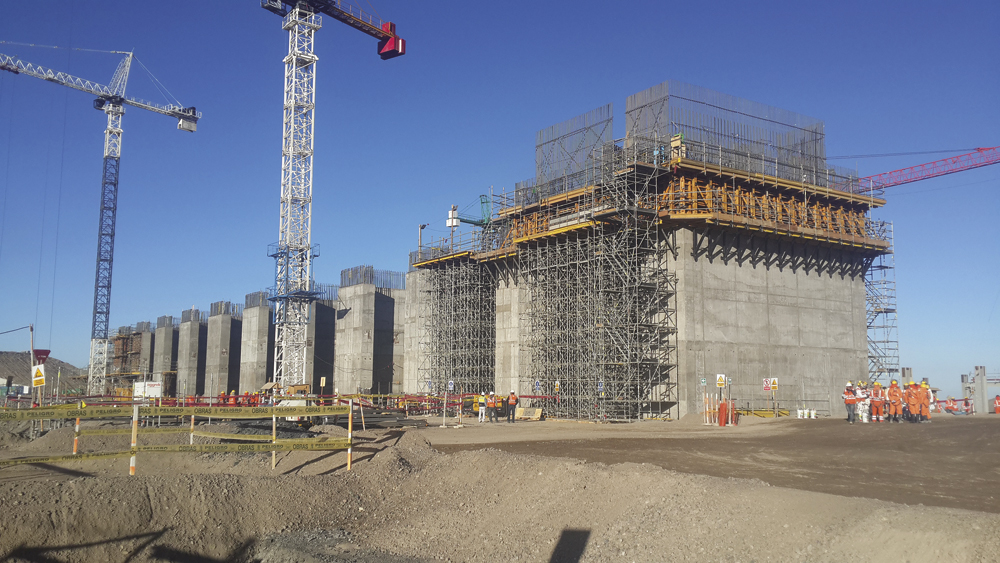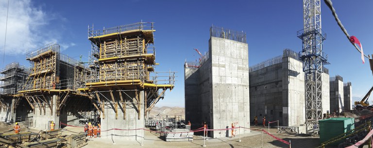 En la primera fase de la Bocatoma, se han empleado encofrados modulares y por lo tanto versátiles: ORMA en muros rectos y, CLR y encofrado circular FLECTOR en muros curvos en tongadas de 2,6 m. Con las múltiples configuraciones de andamio BRIO, los operarios han podido simultanear trabajos mientras continuaba la ejecución en altura.