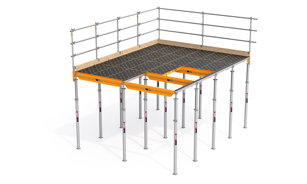 El caso práctico proponía la utilización del encofrado de vigas de madera ENKOFLEX y el encofrado de losa modular de aluminio CC-4 de ULMA para resolver la ejecución de una estructura de hormigón de tres plantas.